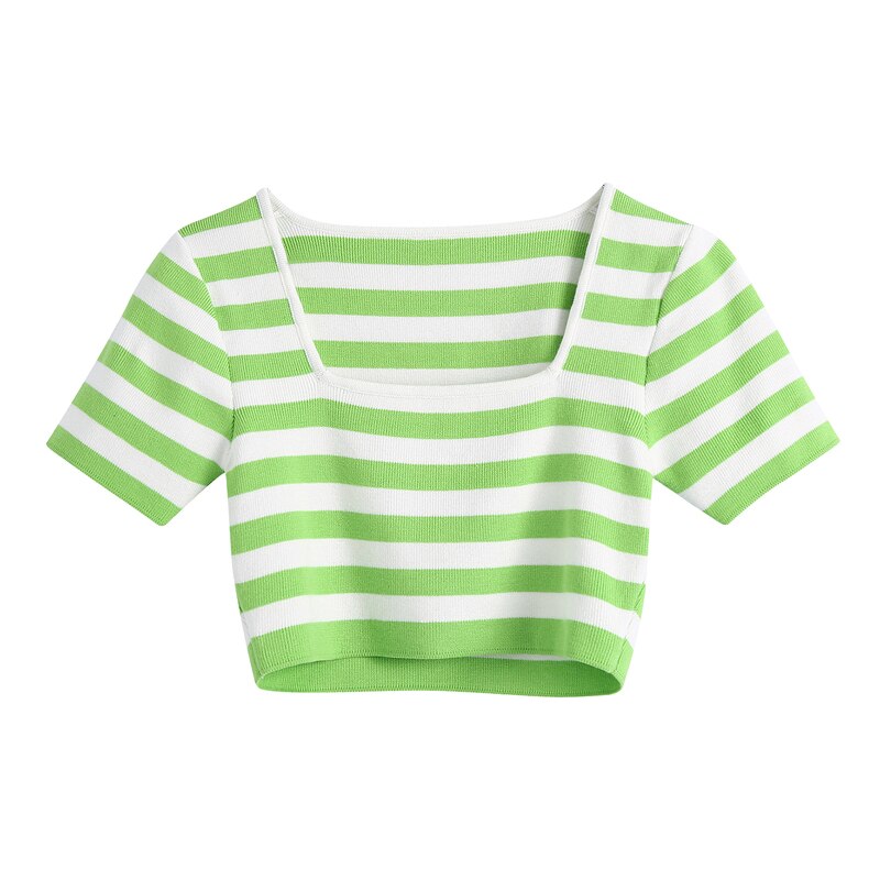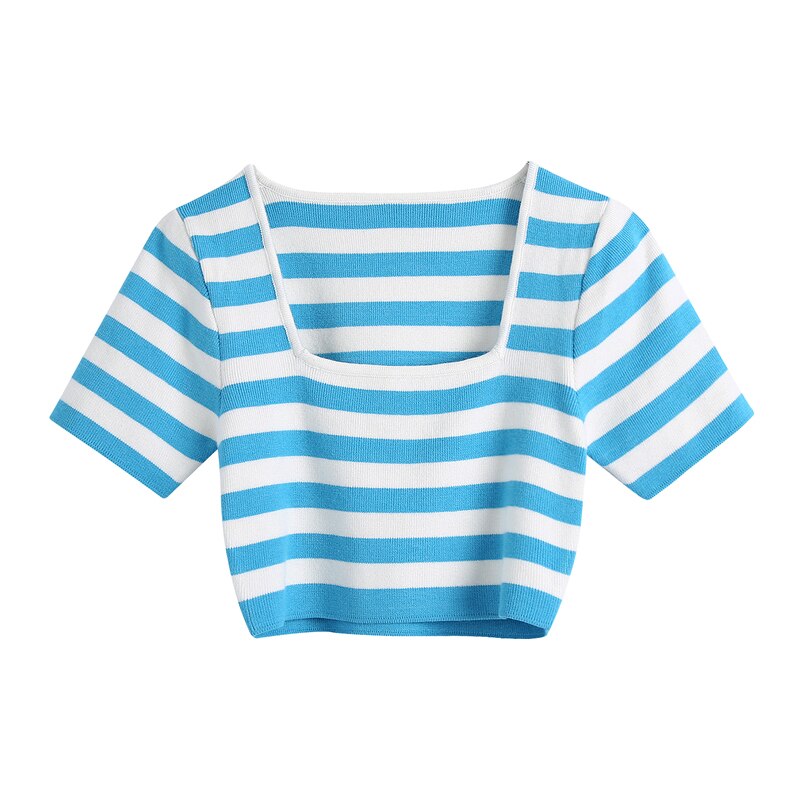 Summer Women's Casual Striped Square Neck Short Sleeve Slim Short Sweater