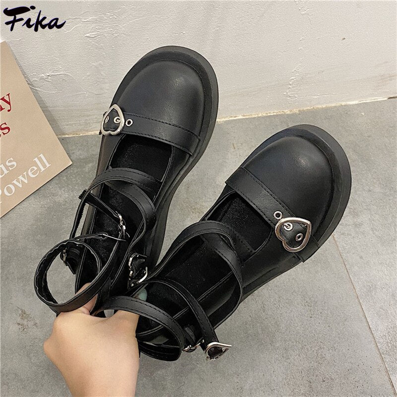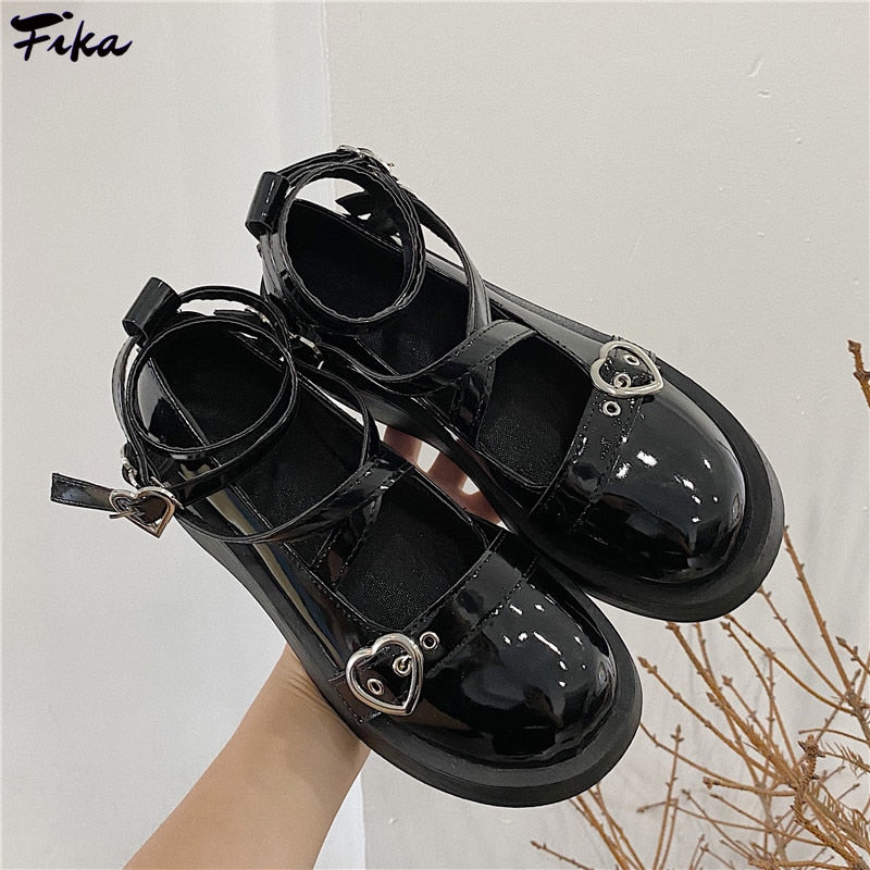 Sweet Lolita Shoes Women Platform Round Head Thick Heel Cross Bandage Leather Mary Janes Shoes Heart Buckle Cosplay Kawaii Shoes