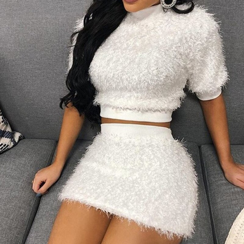 Two Piece Set Women Sweater +Pencil Skirt Suit Short Sleeve Fleece Crop Tops Bodycon Skirt 2 Pieces Set Women Knitted Clothes