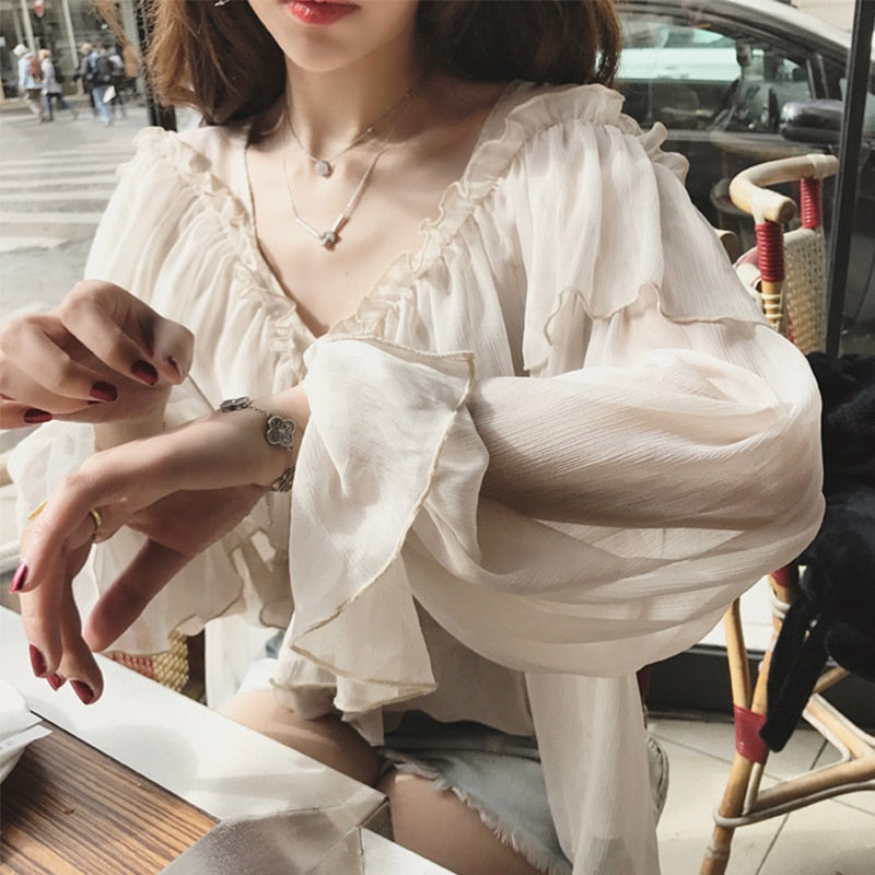 V-neck Sexy Shirts Women See Through Boho Mesh Blouse Summer Ruffle Flare Sleeve Elegant Peplum Tops Ruffles Ladies Blusas 13459