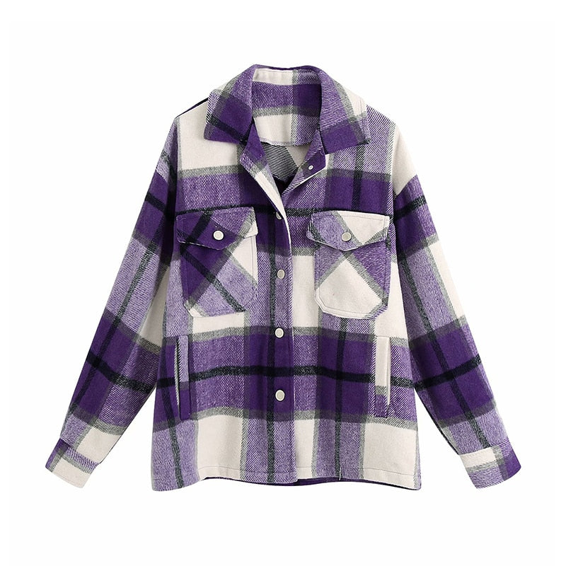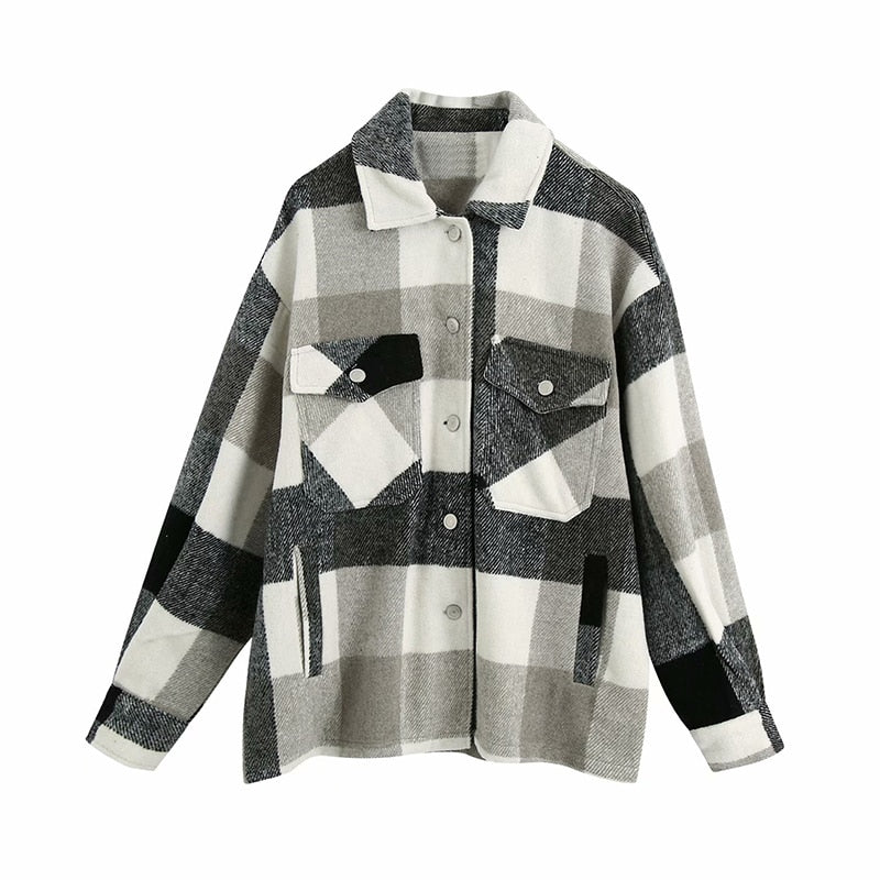 Vintage Stylish Pockets Oversized Plaid Jacket Coat Women 2021 Fashion Lapel Collar Long Sleeve Loose Outerwear Chic Tops