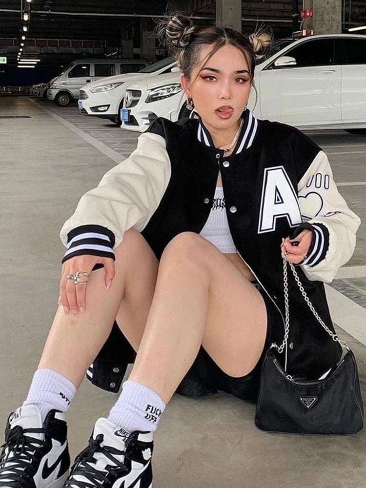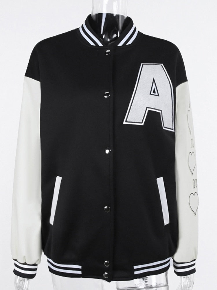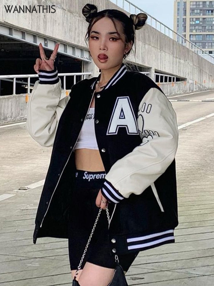 WannaThis Cotton Women Pocket Jacket Patchwork Baseball Long Sleeve Button Letter embroidery Harajuku Fashion Autumn Jacket 2021