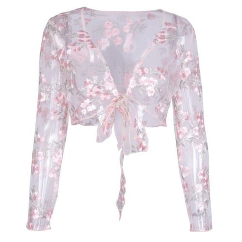 Women Blouse Summer See-through Sheer Mesh Fishnet Long Sleeve Shirt Ladies Tops Blouse Tee Tops Blouses Woman 2019 Floral Shirt