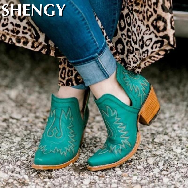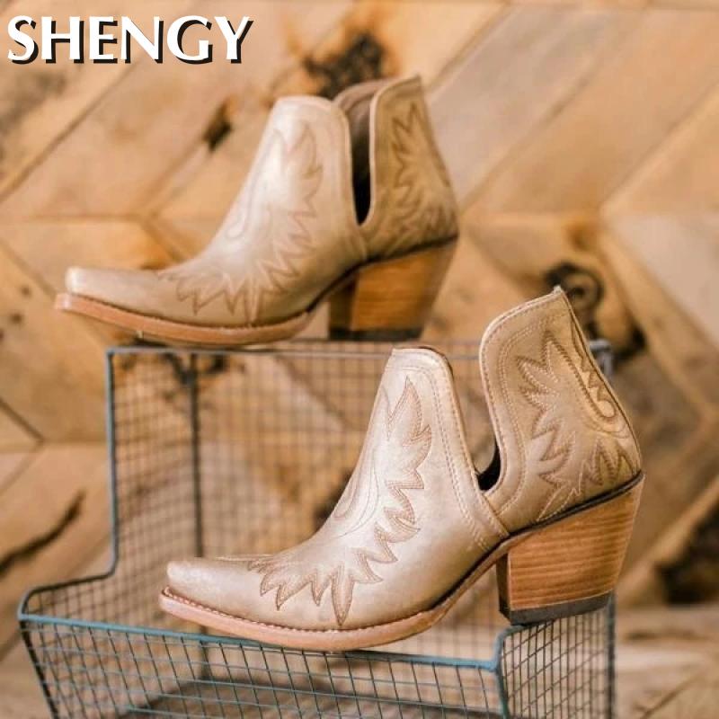 Women Boots Western Chelsea Boots Embroidery Point Toe Print Female Ankle Boots Retro Fashion Females Booties Outdoor Feetwear