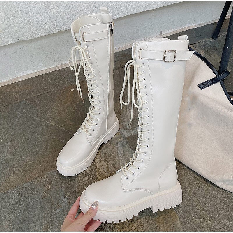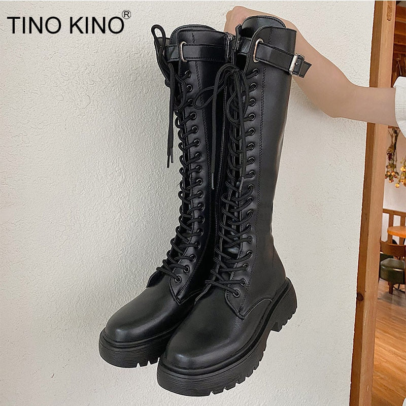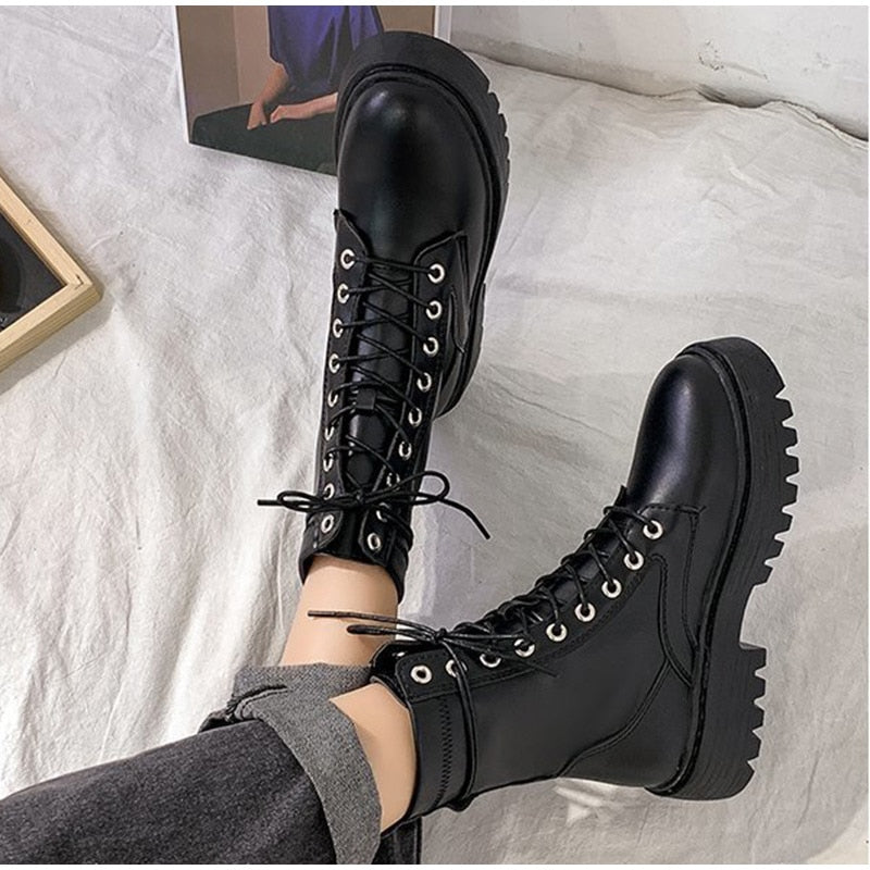 Women Mid Calf Boots Ladies PU Leather Shoes Woman Lace up Fashion Thick Bottom Motorcycle Long Boots Female Non Slip Spring New