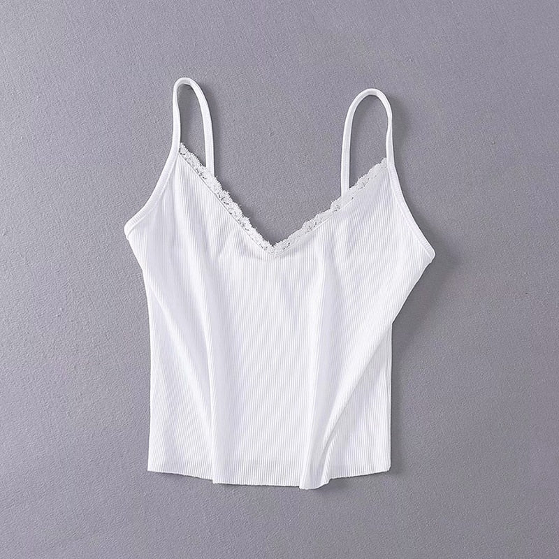 Women V-neck Lightweight Ribbed Cotton Camis Top With Spaghetti Straps And Lace Trimming Female Casual Tank Top Cropped Top