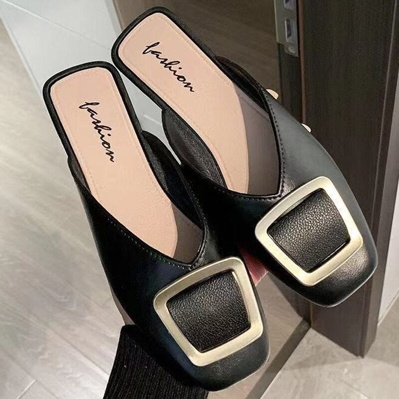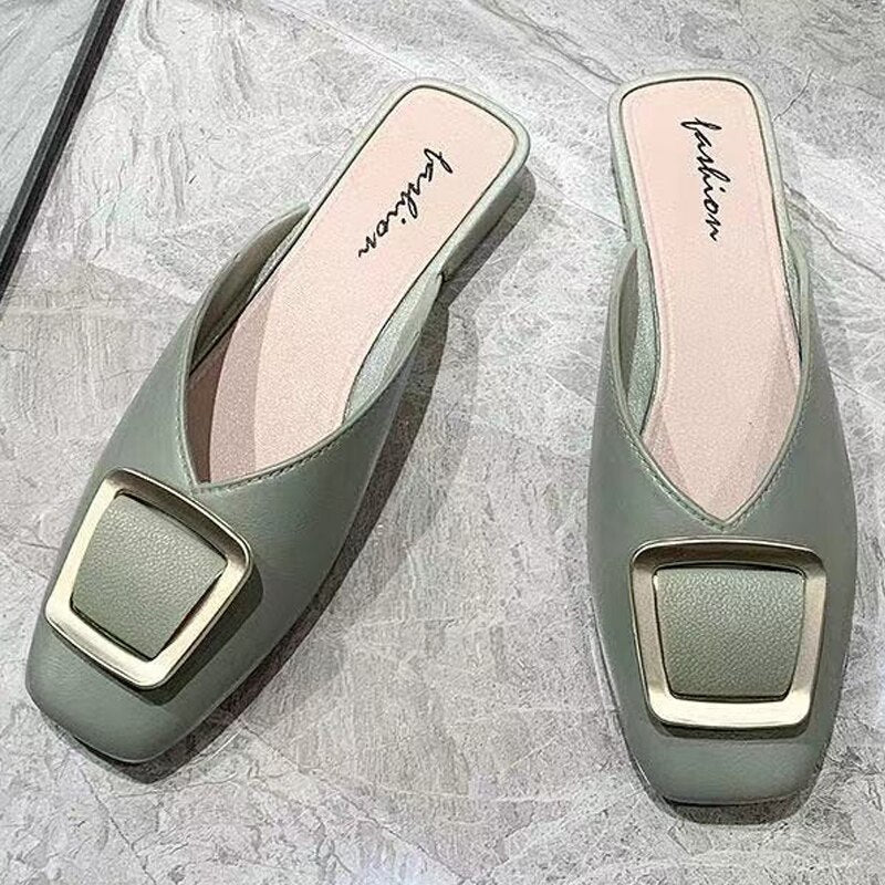 Women's Summer Shoes Slip On Mules Casual Shoes Buckle Square Toe Flats Sandals Brand Designer Sandals Ladies 2021 New Fashion