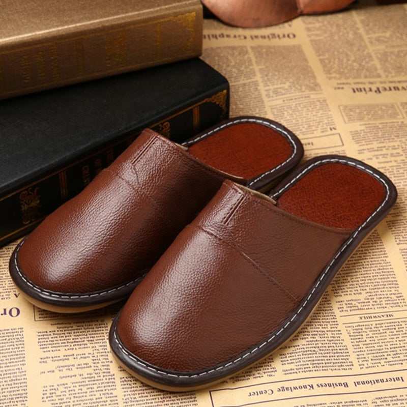 WOTTE Leather Home Slippers for Men Winter Warm Plush Slippers Bedroom Genuine Leather Unisex Men/women House Indoor Shoes