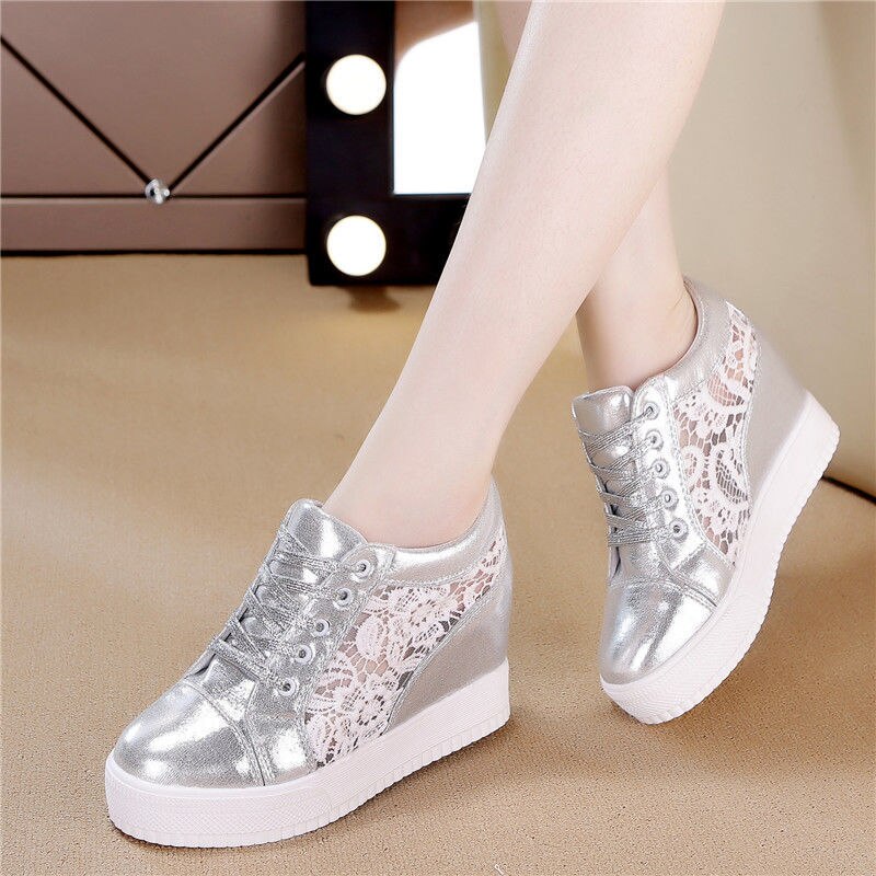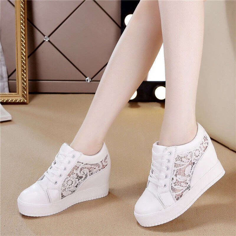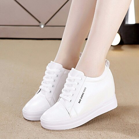 Yyvonne 2022 New Women Wedge Platform Sneakers Rubber Leather High Heels Lace Up Shoes Height Increasing White Thick Bottom 40