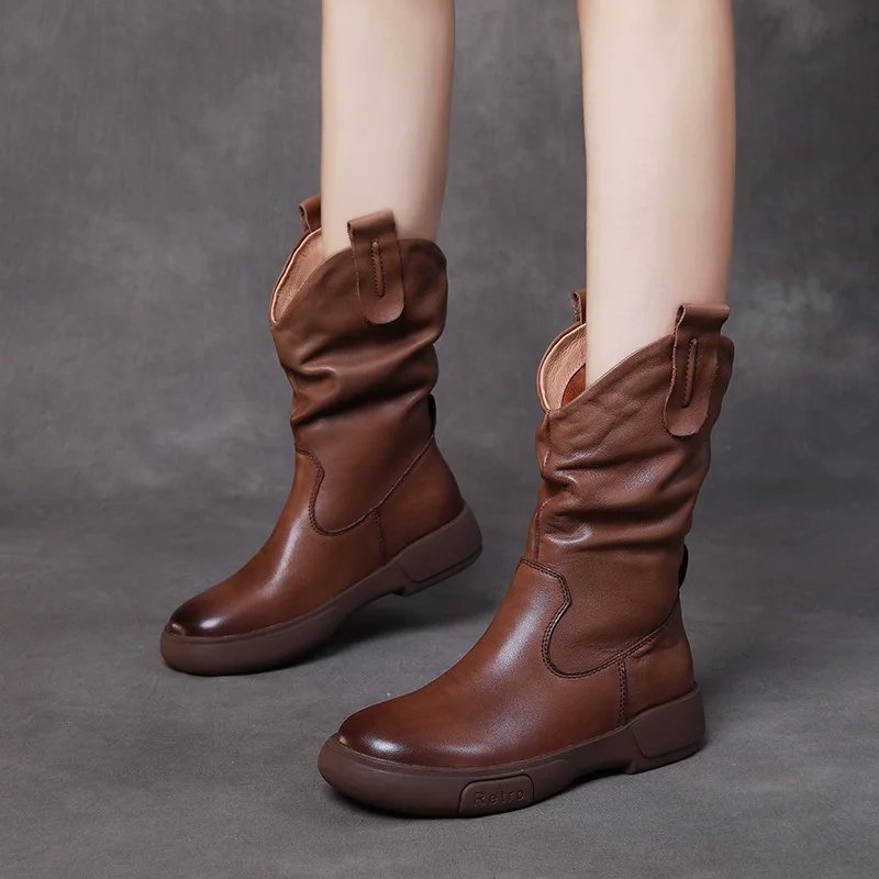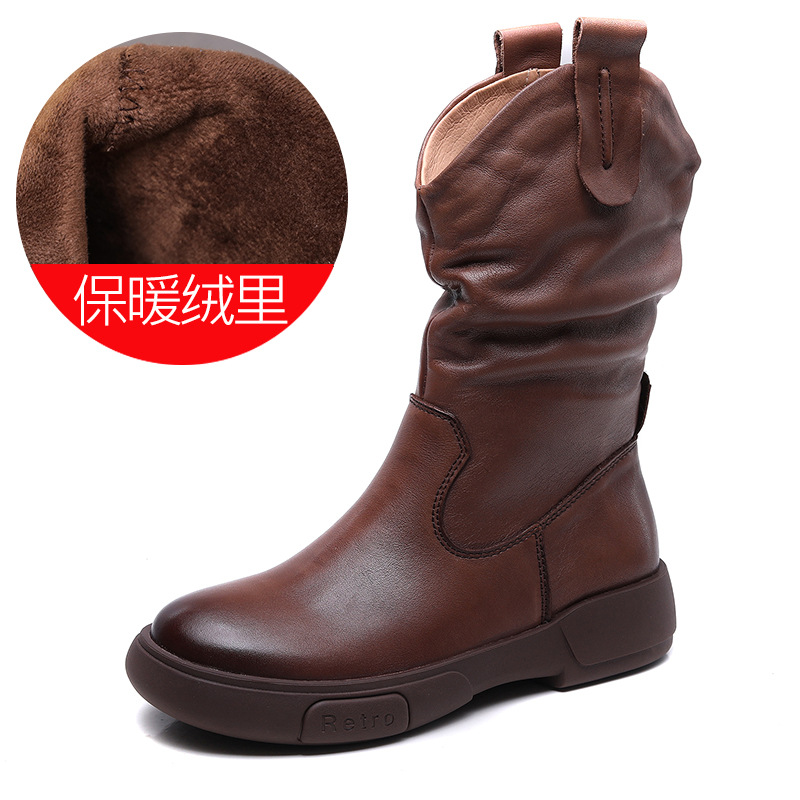 Yyvonne Boots Pile Boots Top Layer Of Kraft Mid-Sleet Boots Women Flat Bottom Soft Skin Autumn Winter Leather Martin Boots Horse Rider Boots