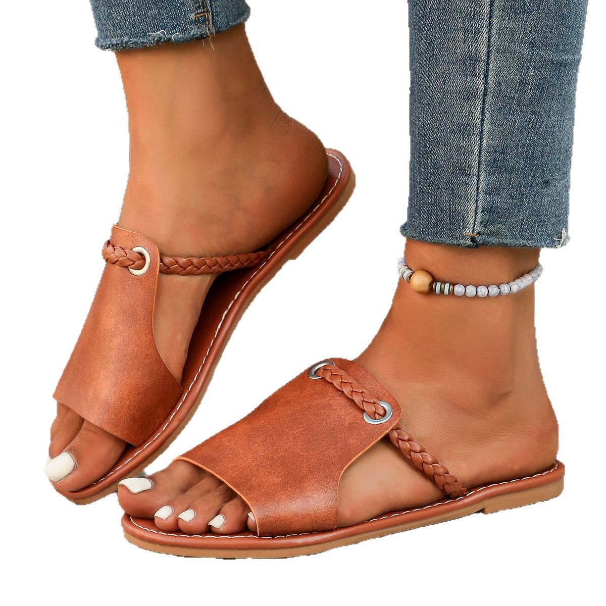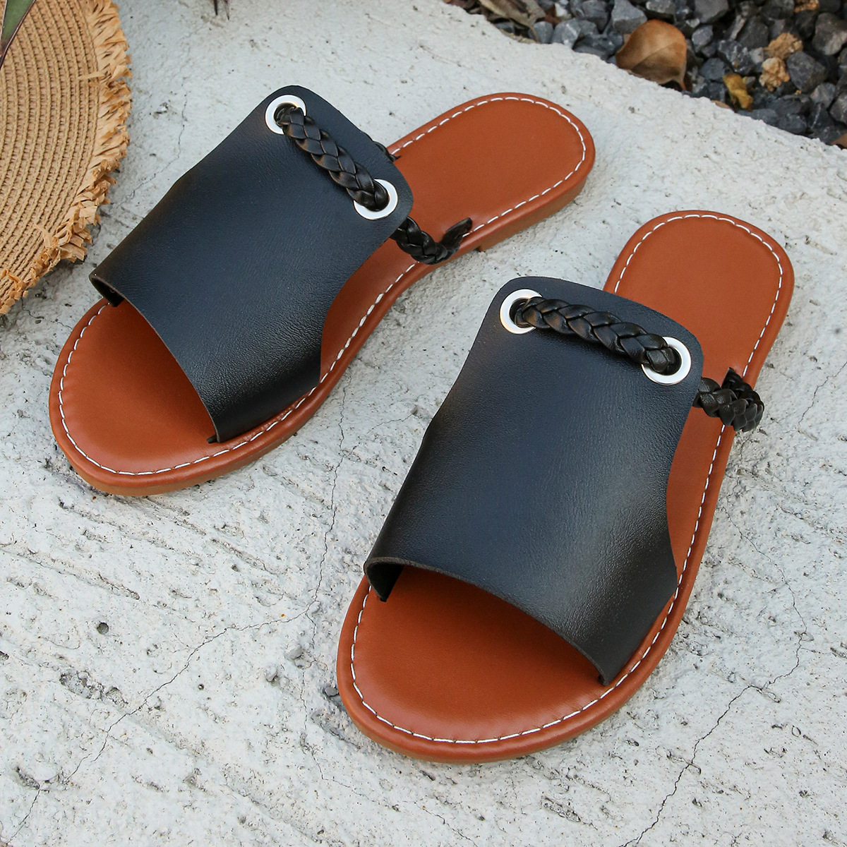 Yyvonne Braided With Fish Mouth Slippers Women Solid Color Wearing A Word Beach Cold Slippers