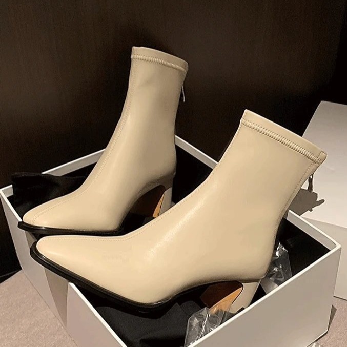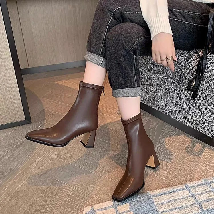 Yyvonne Brown Short Boots Women High And Thick Zipper Square Head 2025 New Winter Korean Version Of Thin Skinny Boots