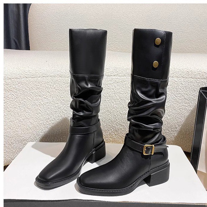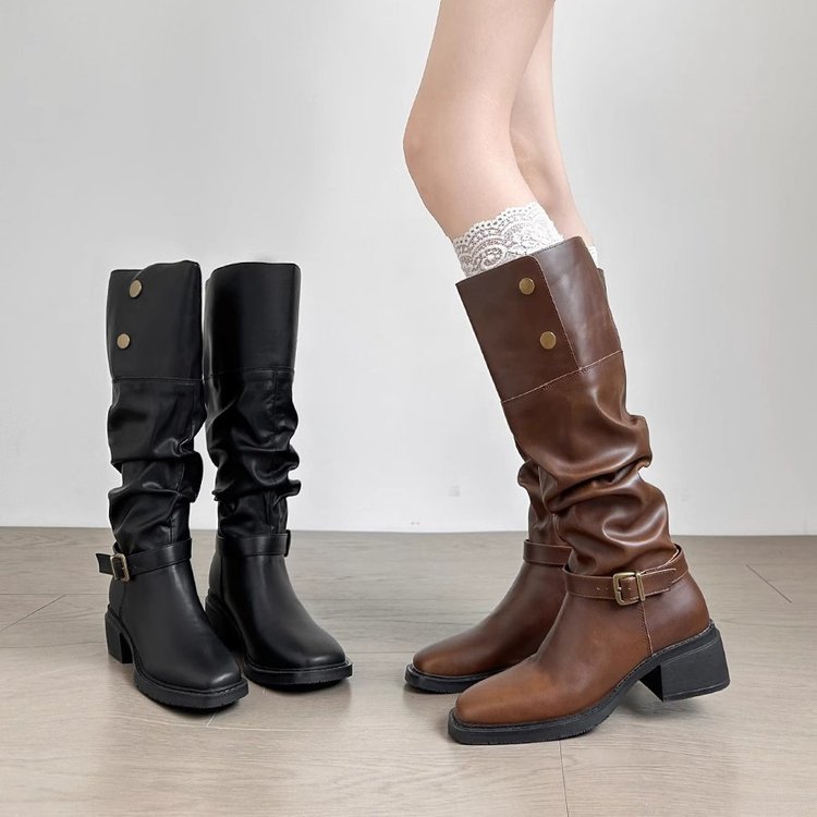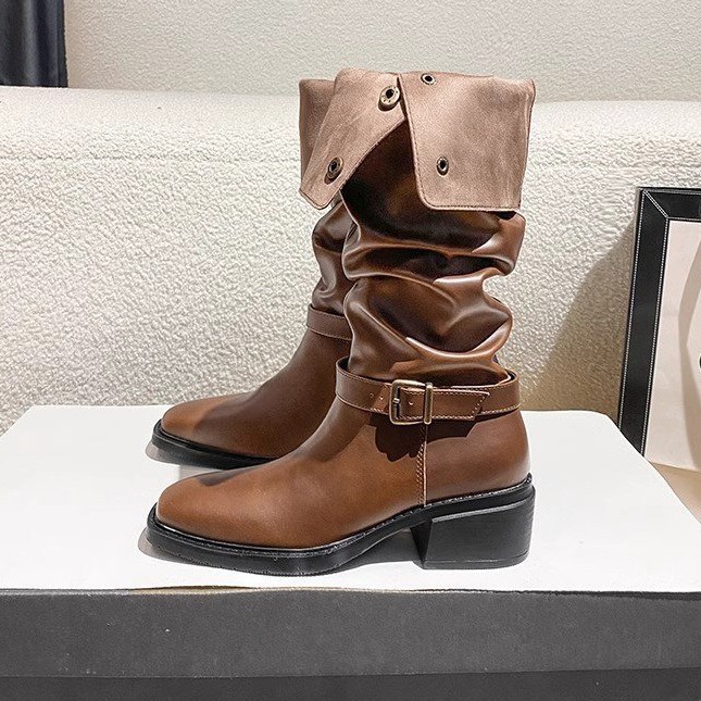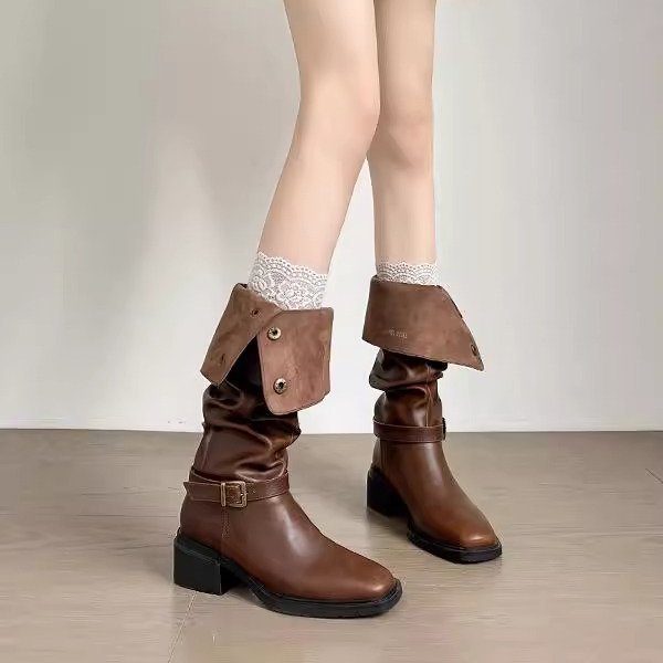 Yyvonne Coarse And Square Head Folding Pile Of Knight Boots New Autumn And Winter Temperament Net Red Two Wearing Brown Retro Boots