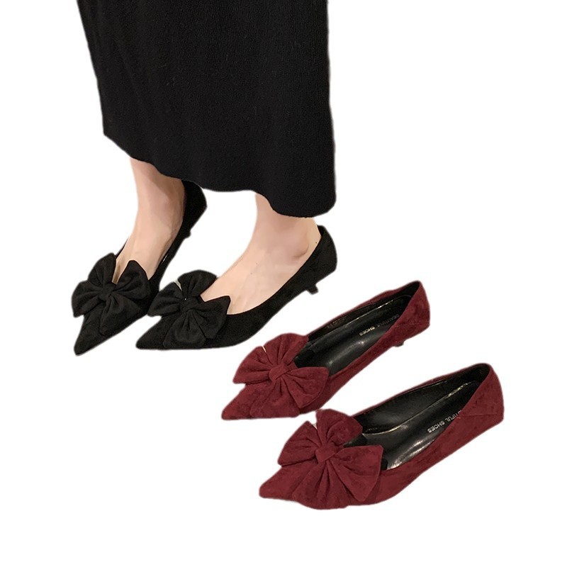 Yyvonne Heel Temperament Single-Shoe Women's Shoes Spring New Velvet Face Sweet Pointed Bow Bow Low Heel Shallow Women's Shoes