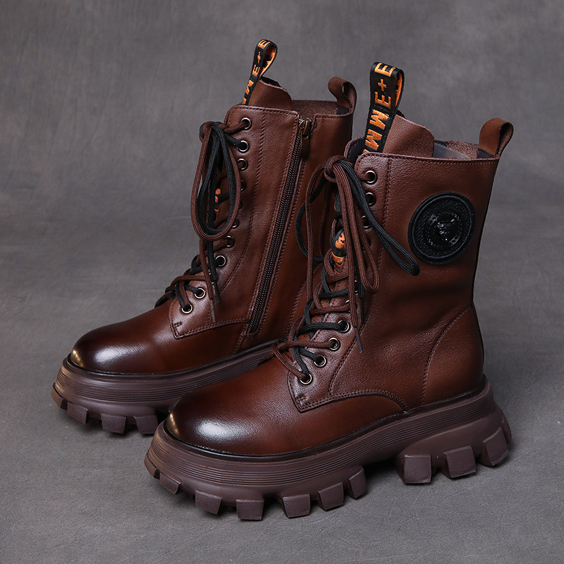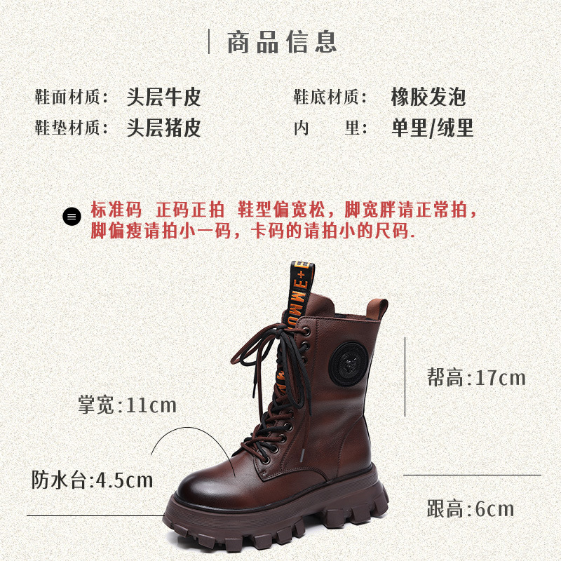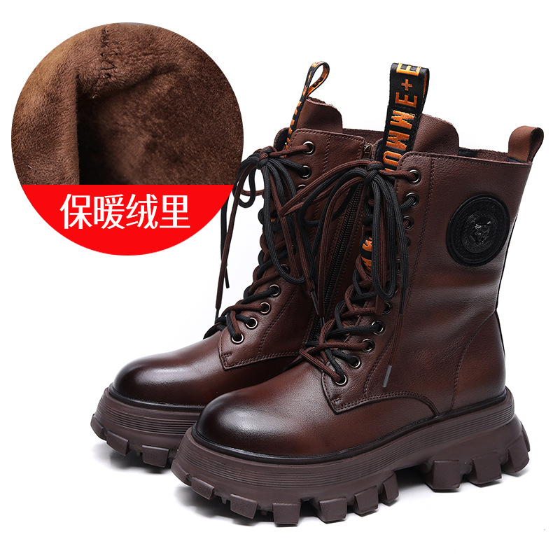 Yyvonne Layer Of Cowhide Autumn And Winter Plus Velvet Warm New Baibian Cake Bottom Cylinder Zipper Locomotive Boots Martin Boots Woman