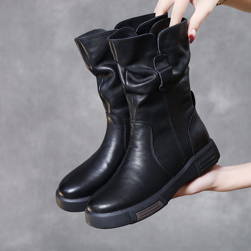 Yyvonne Martin Boots New Autumn And Winter Flat Bottom Mid-Sleet Boots Head Cowhedal Cowhed Vintage Round Head Knight Single Boots
