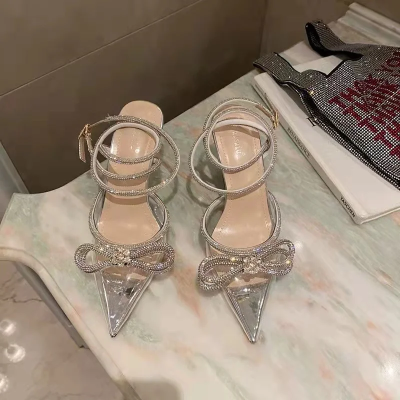 Yyvonne New Fashion Pointy Bow Water Drill High Heels Silk Stumbling Buckle Fine Women Sandals French