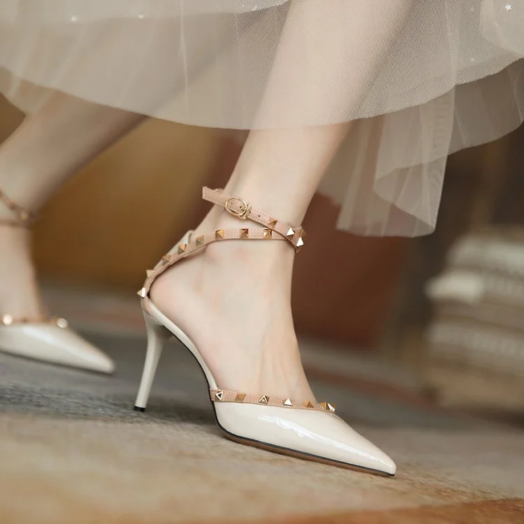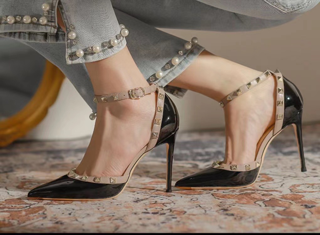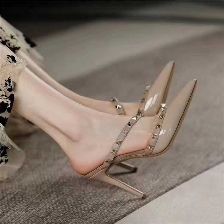 Yyvonne Sandals Women's Korean Version Of The New Baotou Fine Heel Head Fairy Rivet Studs Hollow Buckle Sandals