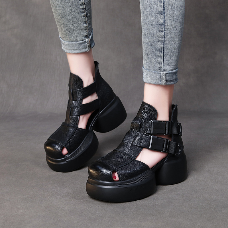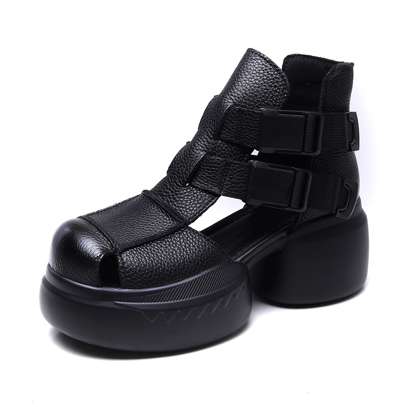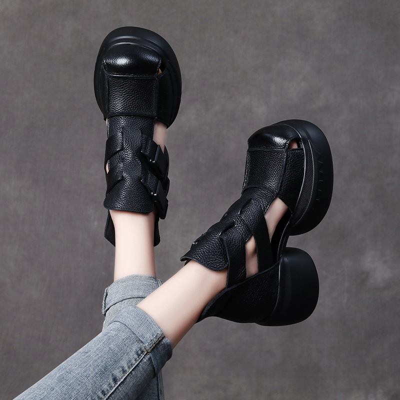 Yyvonne Thick-Soled Sandals Women's Head Cow Skin Retro Art Big Head Slope And Cool Slippers Tide Hollow Loose Cake Shoes