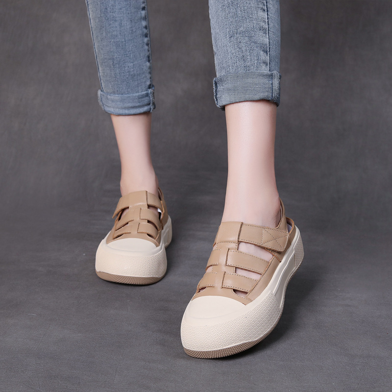 Yyvonne To 99] Leather Sports Sandals Women Wearing Women Wearing Women's Coats Magic Sticker Flat Leather Roman Thick Bottom