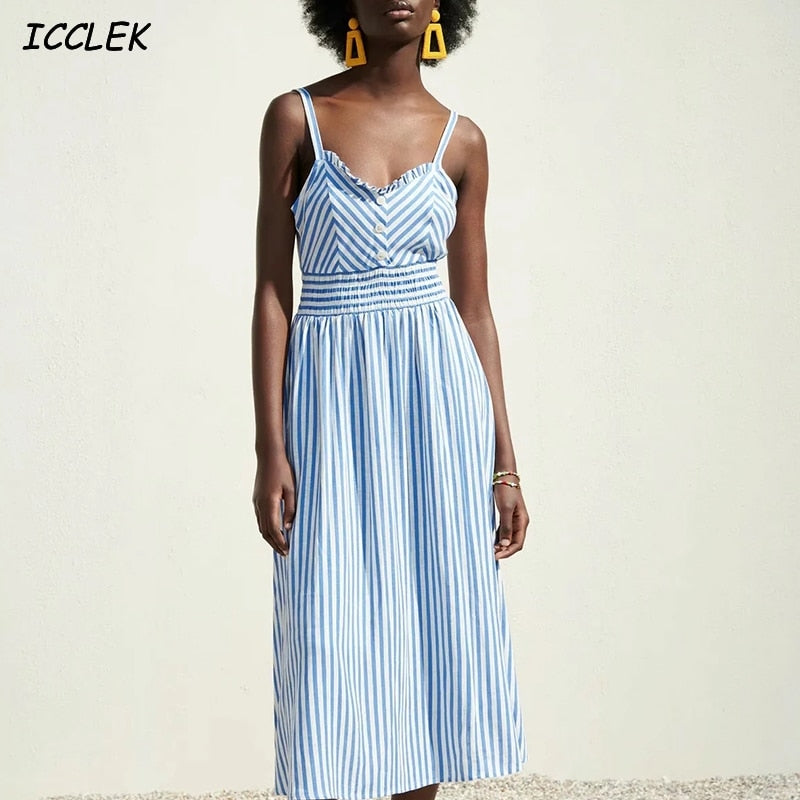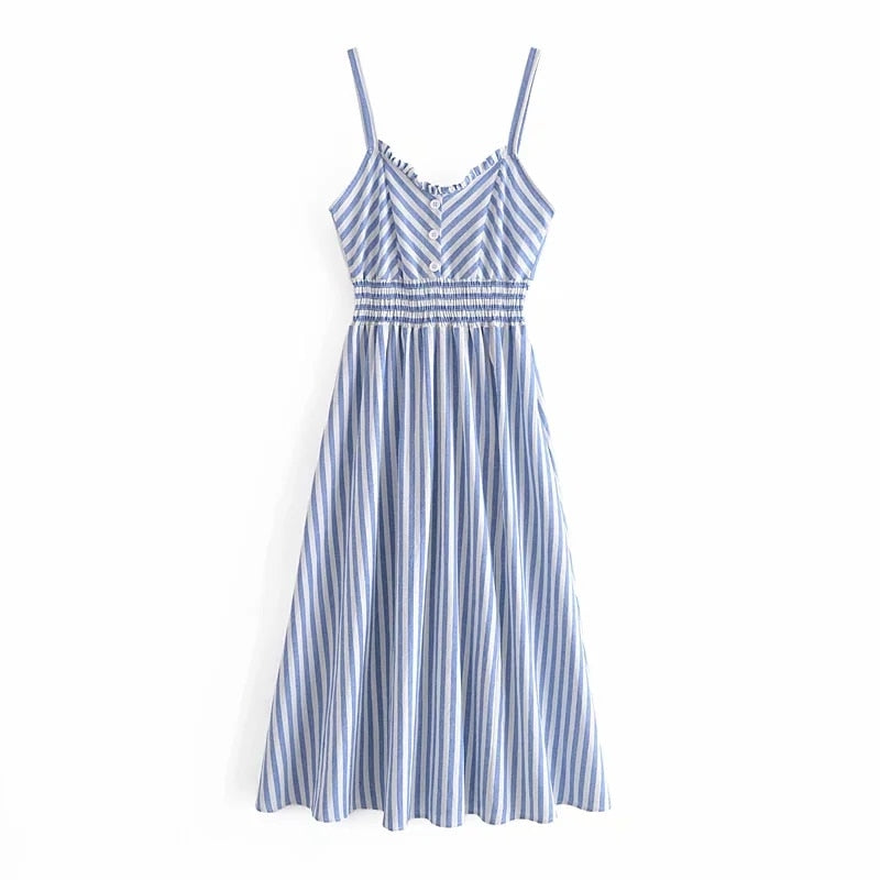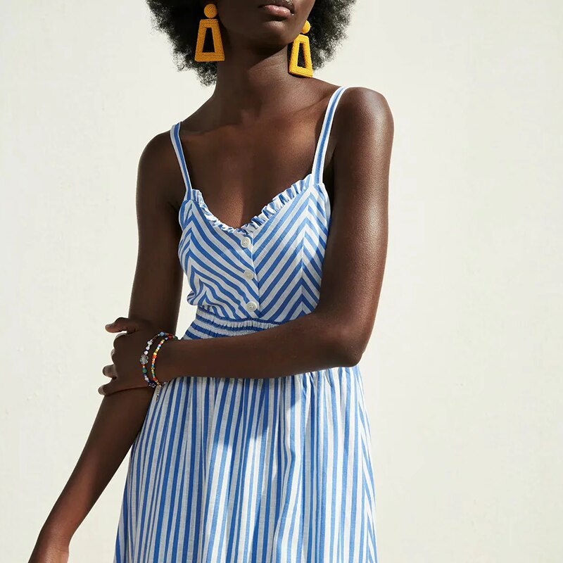 Za Summer Women's Dresses Camisole Striped High Waist Sleeveless Vintage Female V neck Button Vestido Mujer 2021 Casual Backless