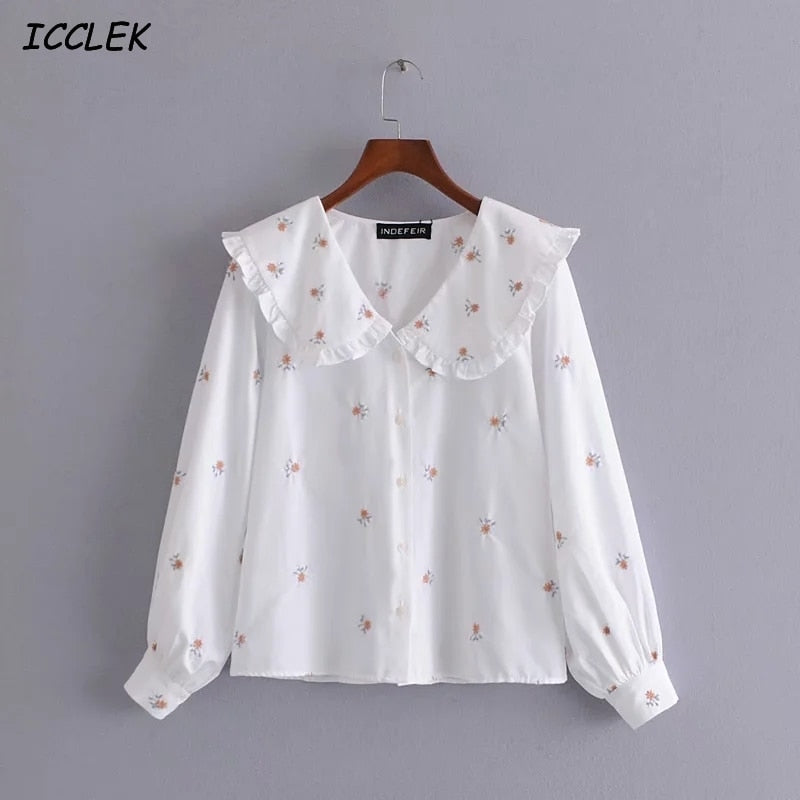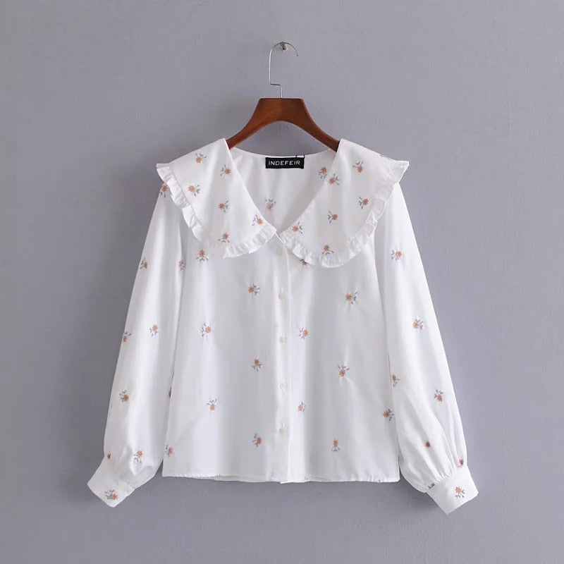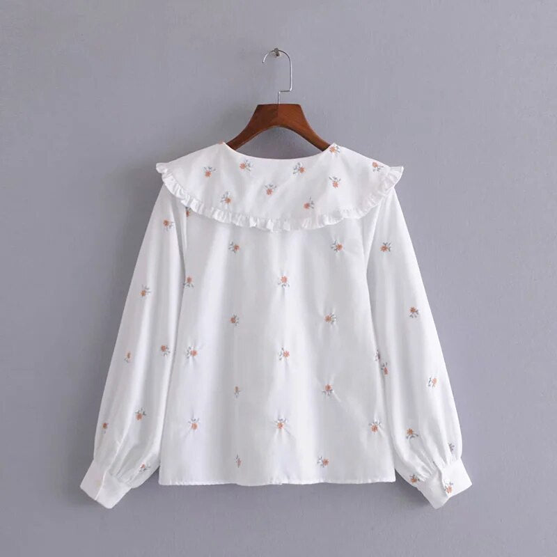 Za Women's Blouses Floral Shirts Embroidery Blusas Mujer White Long Sleeves Cute Peter Pan Collar Blouse Casual Chic Thin Spring