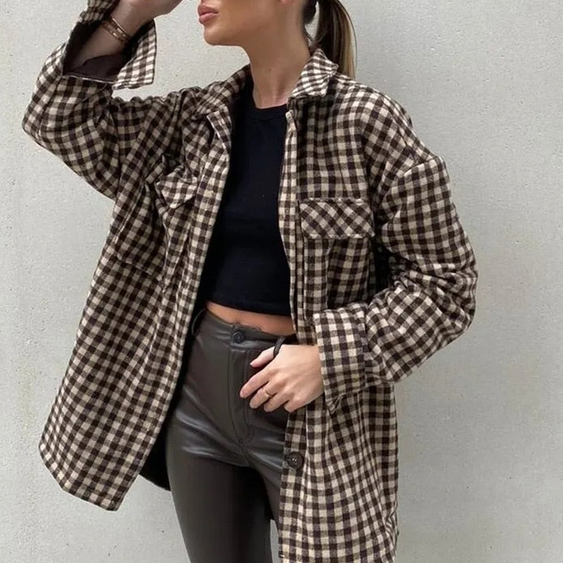 Za Women's Shirts Khaki Blouses Plaid Oversize Blusas Mujer Spring Vintage Jackets Long Sleeves Pockets TRF Loose Casual Coats